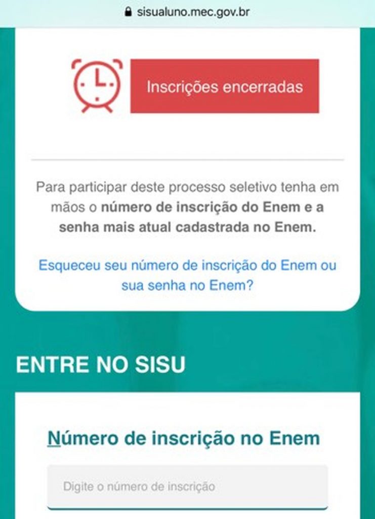 Os estudantes eram redirecionados para uma página com o aviso de que as “inscrições estão encerradas”. Quem conseguia incluir os dados pessoais para prosseguir com a inscrição reclamou de falhas na autenticação.