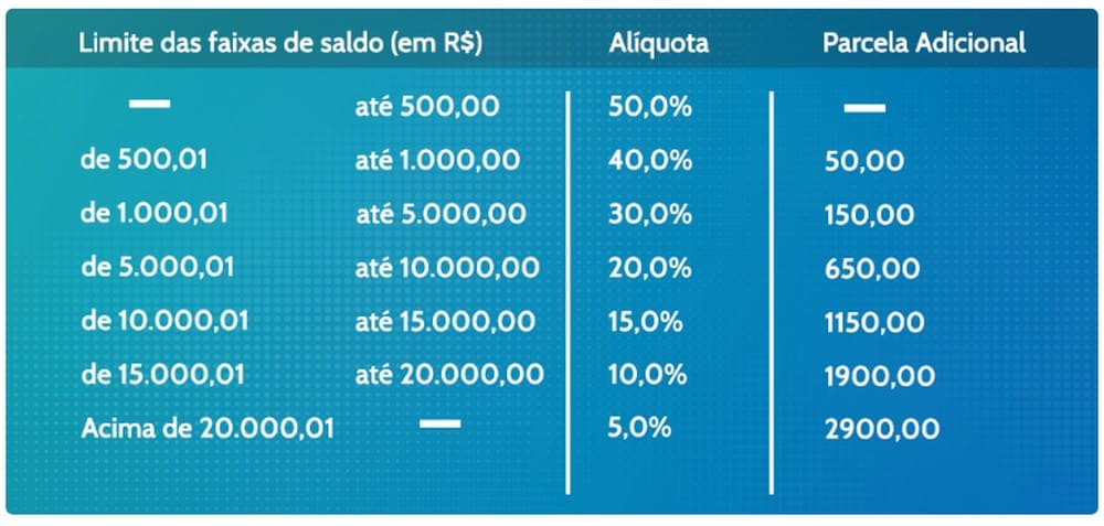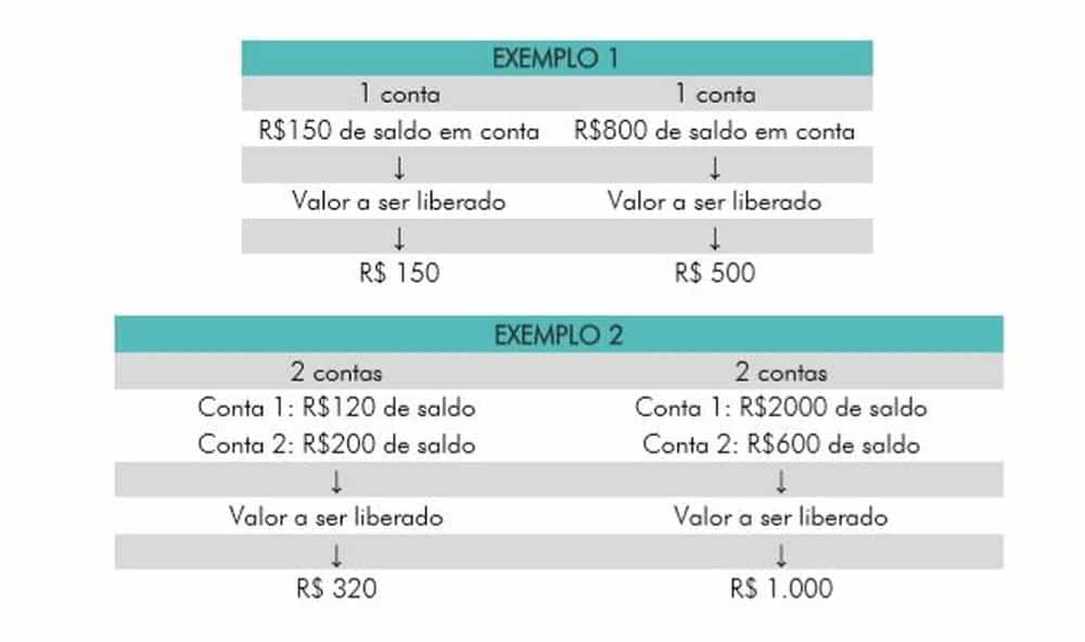 Por exemplo: quem tem R$ 750,00 na conta recebe 40% de R$ 750, que são R$ 300, mais a alíquota adicional de R$ 50, totalizando R$ 350. Quem tem R$ 25.000 na conta recebe 5% de R$ 25.000, que dá R$ 1.250, mais a alíquota adicional de R$ 2.900, que dá o total de R$ 4.150. Quem tem R$ 100.000 recebe 5% de R$ 100.000, que dá R$ 5.000, mais a alíquota adicional de R$ 2.900, que dá o total de R$ 7.900,00. À medida que os saques vão sendo feitos, o saldo diminui, aumentando o valor que pode ser sacado.
