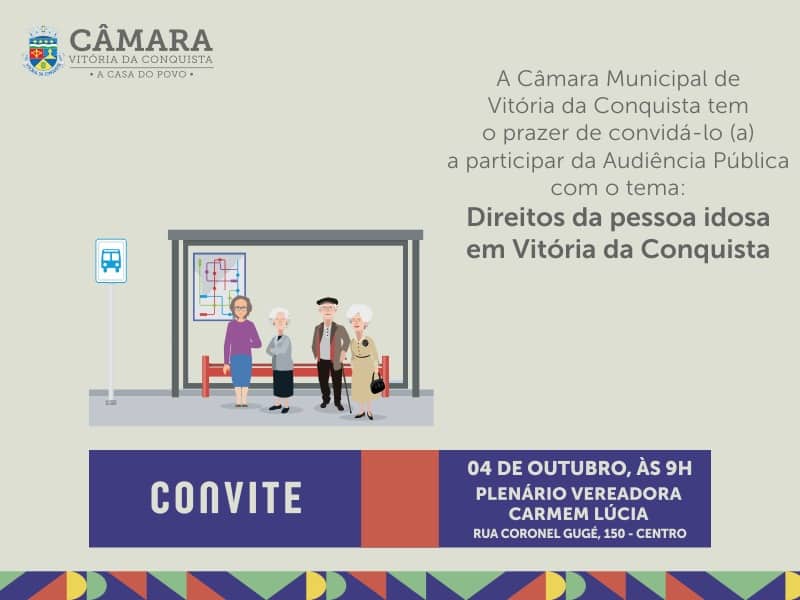 A Câmara Municipal realiza na próxima sexta-feira (04) uma sessão especial com o tema: Direitos da pessoa idosa em Vitória da Conquista. O evento acontece às 9 da manhã no plenário Carmen Lúcia.