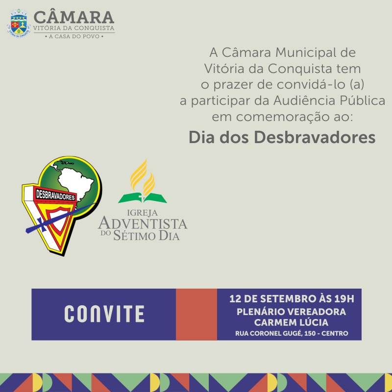 A Câmara Municipal de Vitória da Conquista (CMVC), realizará na noite desta terça-feira,12, a partir das 19h uma Audiência Pública em comemoração ao “Dia dos Desbravadores”.