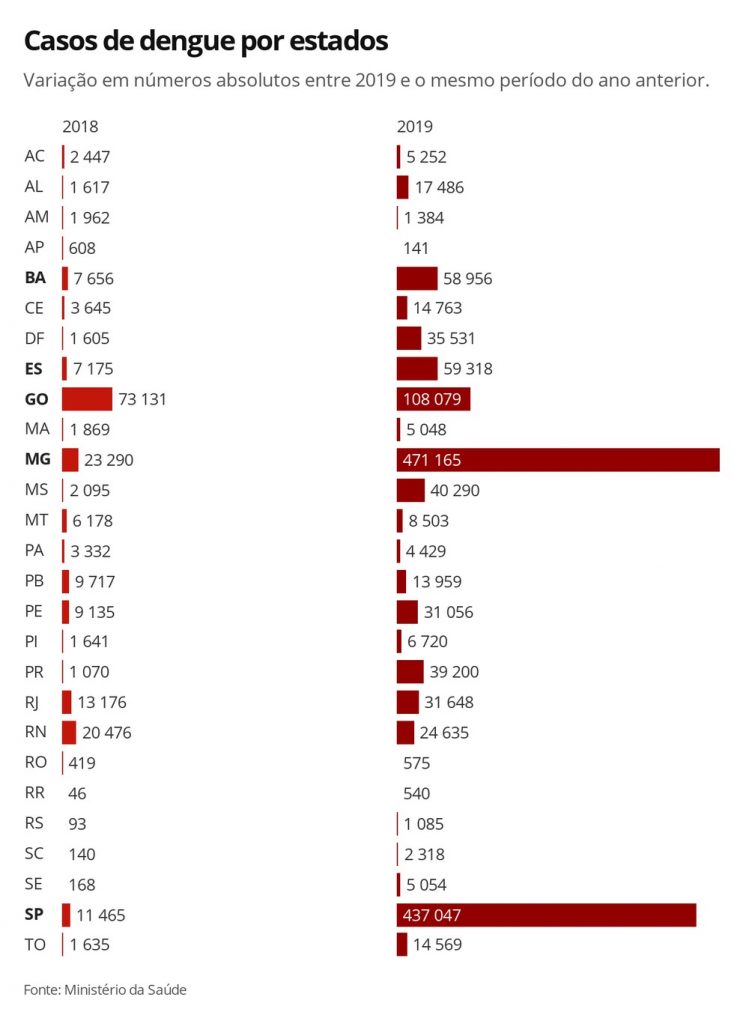 De acordo com o Ministério da Saúde, uma associação de fatores como alto volume de chuvas e altas temperaturas; mudança no sorotipo predominante e ocorrência de dengue em toda a região das Américas explicam o aumento nos casos da doença.