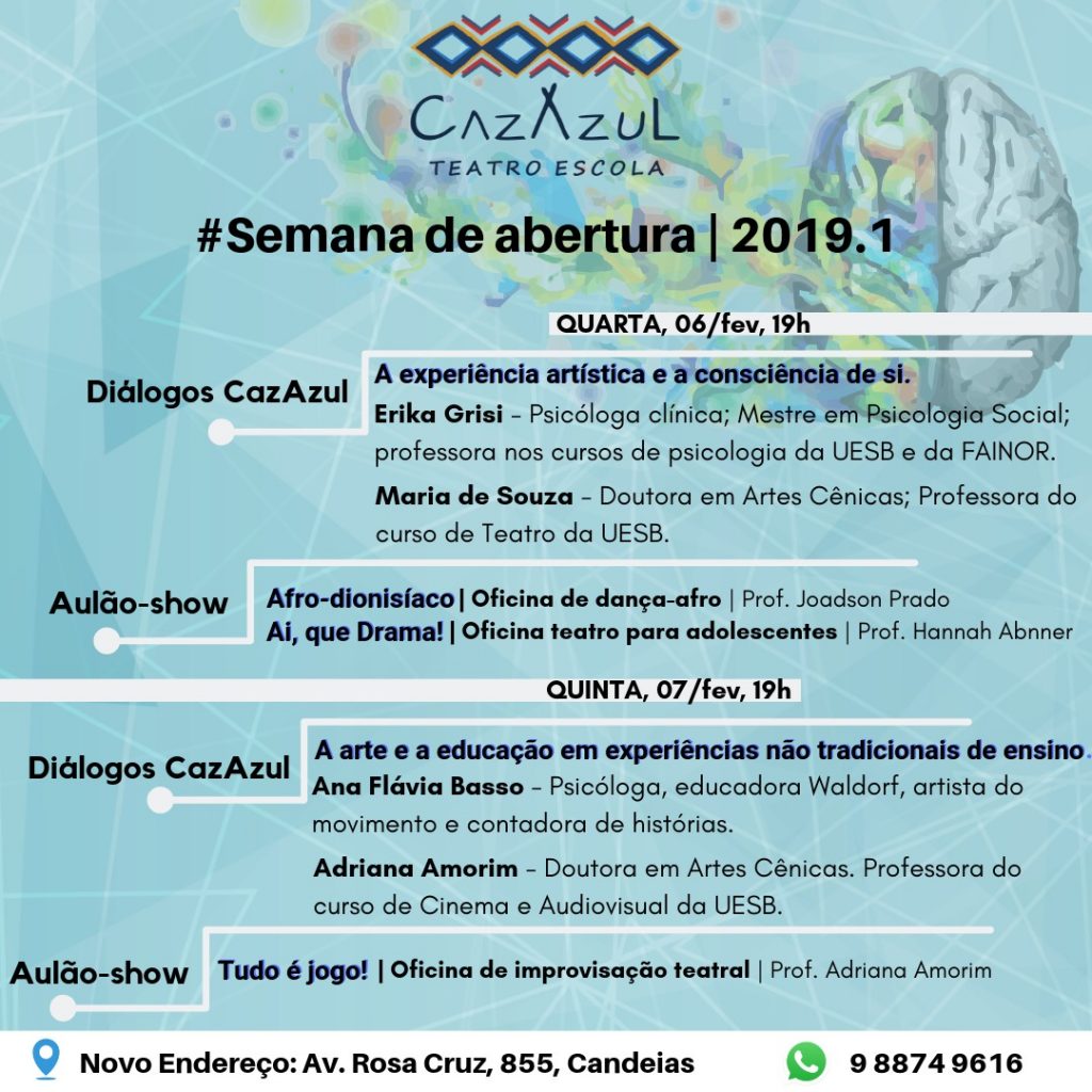 Na quarta-feira (06), a CazAzul receberá a psicóloga e profª da UESB e FAINOR, Érika Grisi; e a atriz, teatróloga e profª de teatro e dança da UESB, Maria de Souza, no ciclo de debates “Diálogos CazAzul”, para falar sobre a “A experiência artística e a consciência de si”. Logo após, o público poderá conferir o Aulão-show das oficinas de férias “Afro-dionisíaco” (dança afro) e “Ai, que Drama” (teatro para adolescentes).