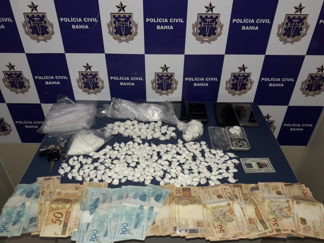 Após investigações, a equipe da DTE efetuou uma busca na residência do autor, localizada na Av. Guanambi, no bairro Ibirapuera , onde os investigadores apreenderam centenas de petecas pequenas e grandes de cocaína em pó, prontas para venda , além de uma balança de precisão usada no tráfico, embalagens de drogas, dinheiro da venda da cocaína e um veículo corsa usado na atividade ilícita.