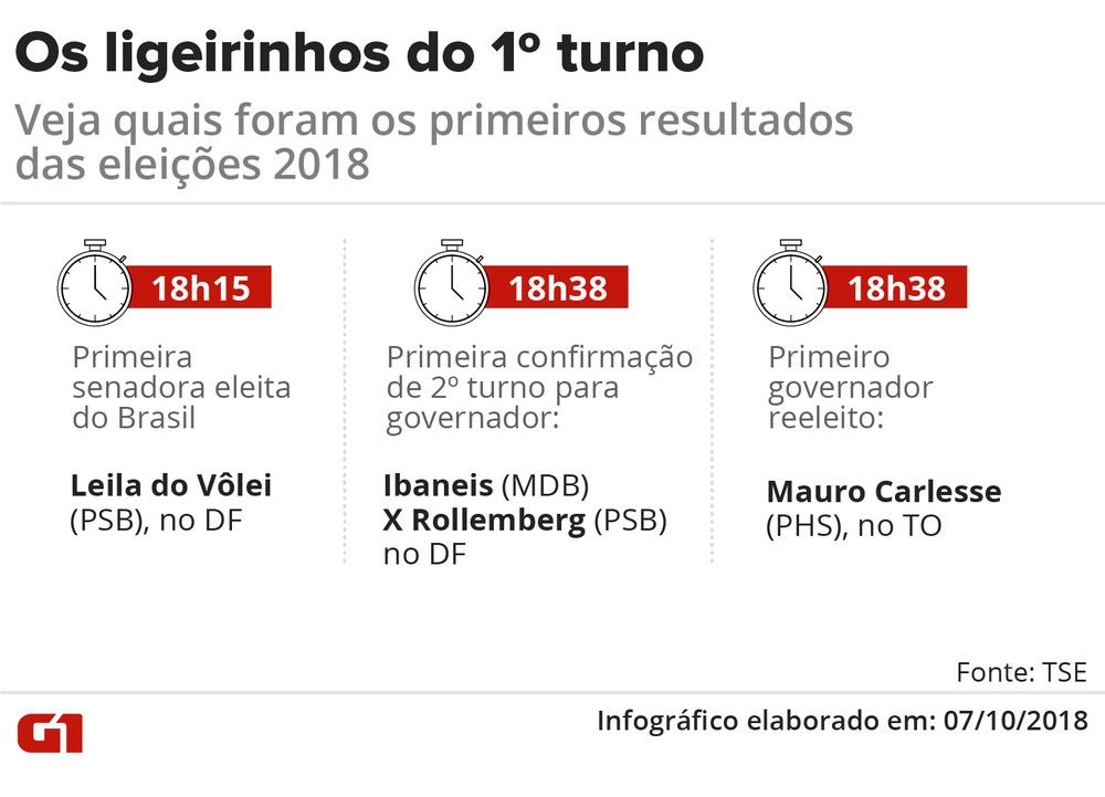 Mauro Carlesse (PHS) foi o primeiro governador reeleito do país, no Tocantins, também às 18h38. Já Renato Casagrande (PSB) foi o primeiro governador que não concorria à reeleição a ser eleito no país, no Espírito Santo.
