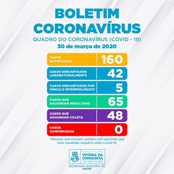 Nesta segunda-feira (30) a Secretaria Municipal de Saúde divulgou Boletim com dados atualizados do Coronavírus em Vitória da Conquista. Até o momento, já foram registradas 160 notificações com suspeita clínica e epidemiológica de infecção pelo Covid-19 e nenhum caso foi confirmado.