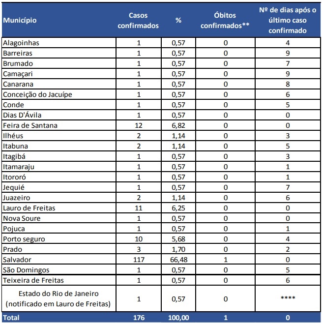 Além dos 176 registros confirmados, outros 2.530 casos são suspeitos. Ainda nesta segunda, o boletim da Sesab confirmou o 2º caso confirmado em uma criança. Ela mora na cidade Feira de Santana e está em bom estado de saúde.