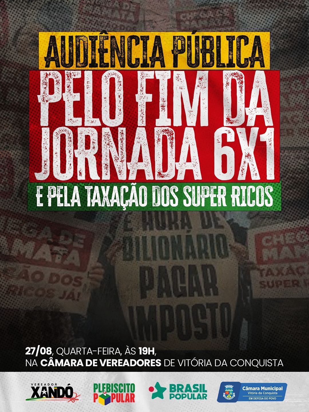 Na próxima quarta-feira, 27 de agosto, a Câmara Municipal de Vitória da Conquista será palco de uma audiência pública para discutir o Plebiscito Popular de 2025. A atividade é fruto da articulação de movimentos sociais, sindicatos e partidos de esquerda, a partir de proposição do vereador Alexandre Xandó (PT).