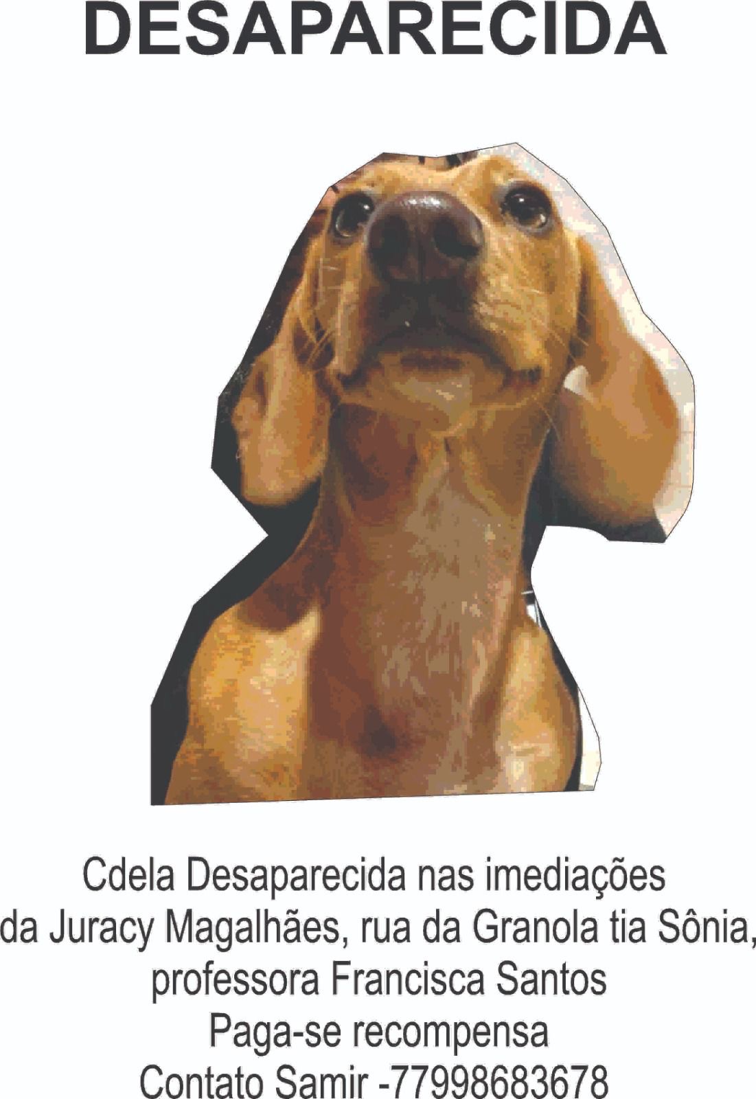 Uma cadela da raça Dachshund conhecida como “salchicha” está desaparecida nas imediações da Juracy Magalhães, na rua da professora Francisca Santos, próximo à Granola tia Sônia.