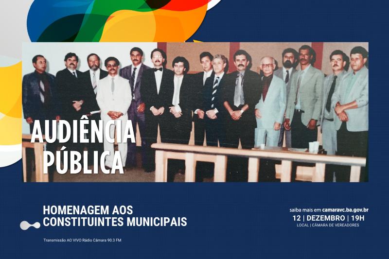 Na noite desta terça-feira, 12, a Câmara Municipal de Vitória da Conquista realizará uma Audiência Pública para comemorar a promulgação da Lei Orgânica em 1990 e os vereadores constituintes da época. Como uma iniciativa do mandato do vereador Edivaldo Ferreira Jr., essa audiência acontecerá no Plenário Carmen Lúcia, às 9h.