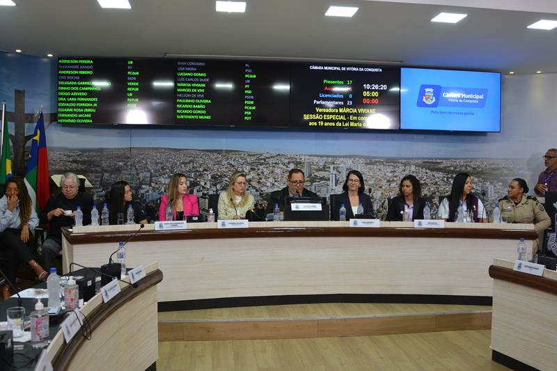 Na manhã desta terça-feira (06), a Câmara de Vereadores de Vitória da Conquista realizou uma sessão especial em homenagem aos 19 anos da Lei Maria da Penha. O evento, proposto pela vereadora Márcia Viviane (PT), reuniu autoridades, representantes do sistema de justiça, forças de segurança, movimentos sociais e especialistas da rede de enfrentamento à violência contra a mulher, e abriu o Agosto Lilás.