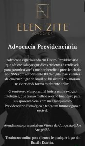 Natural da Bahia, formada em Direito em 2009, pós graduada em Direito Previdênciário em 2012. Na advocacia, já transitou como generalista nas mais diversas áreas, tendo atuado, inclusive, no Tribunal do Júri por vários anos e fazendo parte do Conselho Penal de Vitória da Conquista. Funcionou como Advogada Dativa do Tribunal de Justiça da Bahia e foi Delegada da OAB/BA na Subsecção de Vitória da Conquista. Hoje a sua atuação é exclusiva como Previdenciarista. É uma defensora que ama, incentiva com verdadeira paixão e convicção a condição de que todo cidadão brasileiro deve ser um segurado da previdência social, como um direito elementar a sua condição de cidadania. Conheça mais do trabalho da dr. Elen Zite através do Instagram: @elenziteadvogada