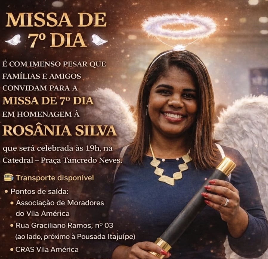Familiares e amigos convidam para a missa de 7° dia em homenagem a Rosânia Silva, momento de fé, saudade e oração em sua memória.