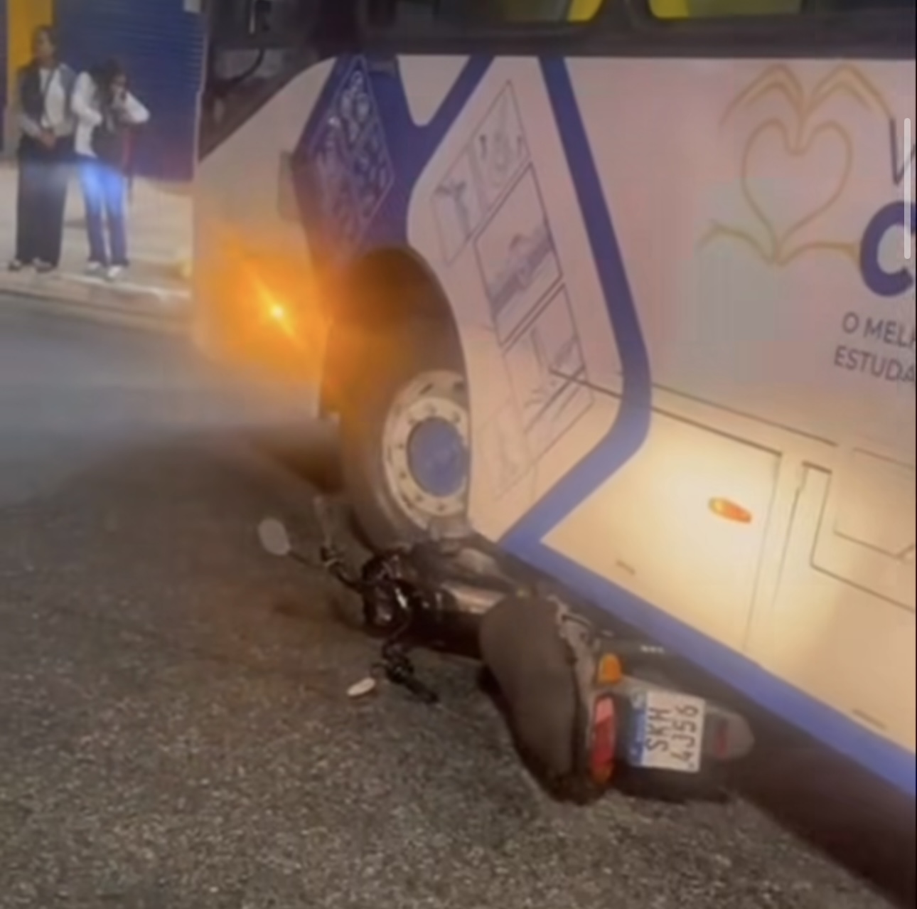 O caso envolveu um ônibus do transporte coletivo e uma motocicleta, que acabou ficando embaixo do veículo. Segundo informações, o piloto conseguiu pular a tempo e não sofreu ferimentos graves.