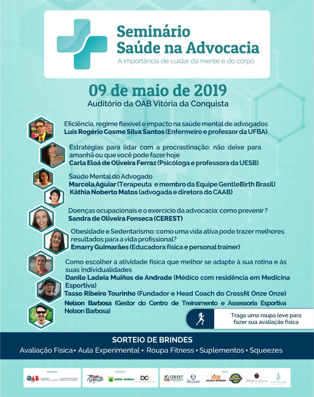 O primeiro evento, intitulado Seminário Saúde na Advocacia: A importância de cuidar da mente e do corpo, ocorrerá no dia 09 de maio, no auditório da Subseção, com início às 07h30. O evento contará com palestras e atividades de profissionais da saúde, advogados e treinadores físicos e visa estimular o cuidado com a saúde através do desenvolvimento de atividades físicas e de ações que previnam o surgimento de psicopatologias.