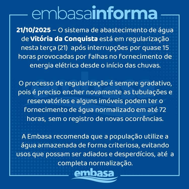 A Embasa informa que o Sistema Integrado de Abastecimento de Água de Vitória da Conquista está em regularização nesta terça (21) após interrupções provocadas por falhas no fornecimento de energia elétrica que totalizaram quase 15 horas desde o início das chuvas.