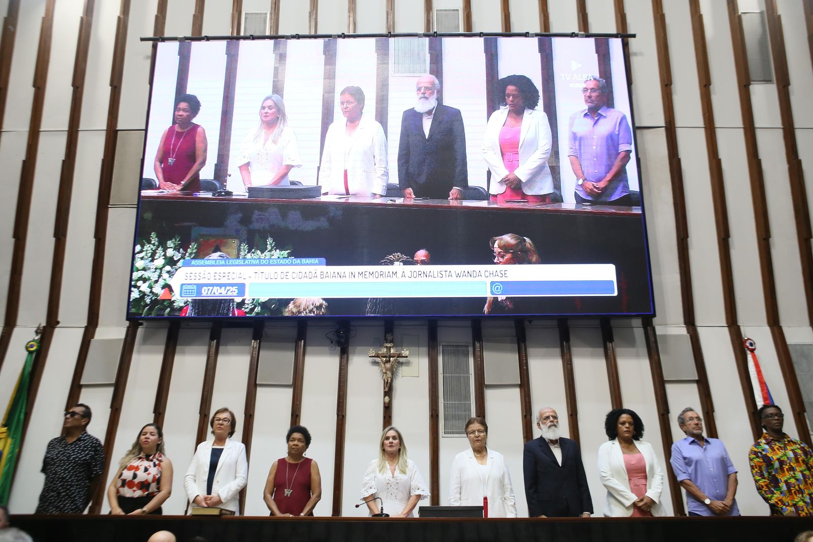 Em uma sessão especial marcada pela emoção e pela saudade, do início ao fim, a Assembleia Legislativa da Bahia – ALBA homenageou, na tarde desta segunda-feira (7.04), a memória da jornalista Wanda Chase com a entrega post mortem, aos familiares dela, do Título de Cidadã Baiana. “Esse é um instante de memória, reverência e ternura silenciada pela ausência”, discursou a presidente da ALBA, deputada Ivana Bastos, ao saudar a família de Wanda, representada na mesa pela irmã, Thelma Chase, e a bancada do PT, proponente da sessão, representada pela deputada Fátima Nunes.