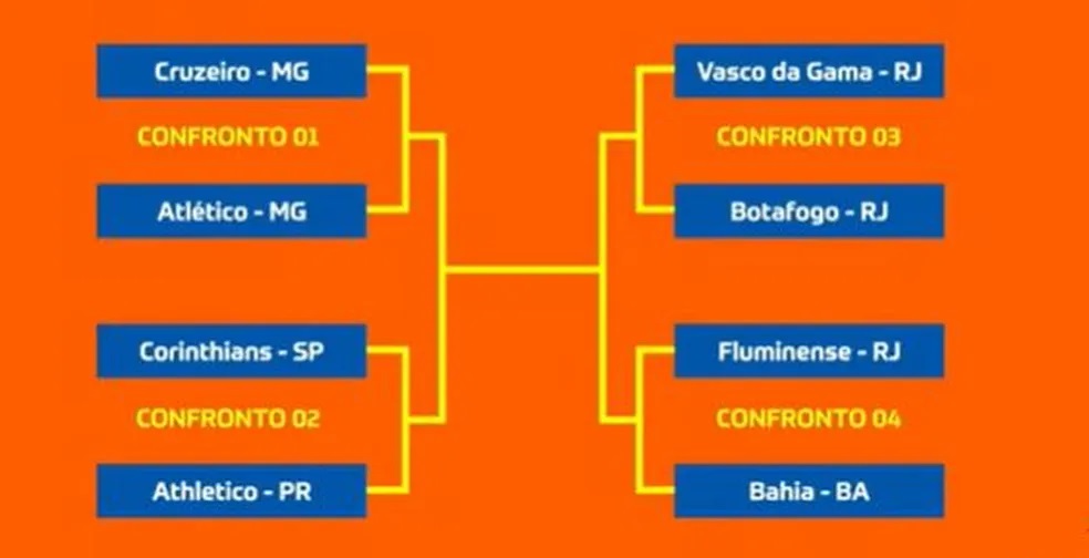 Quem passar do confronto entre os clubes mineiros enfrenta Corinthians ou Athletico-PR nas semifinais. Do outro lado, o vencedor do clássico carioca vai medir forças com Fluminense ou Bahia.