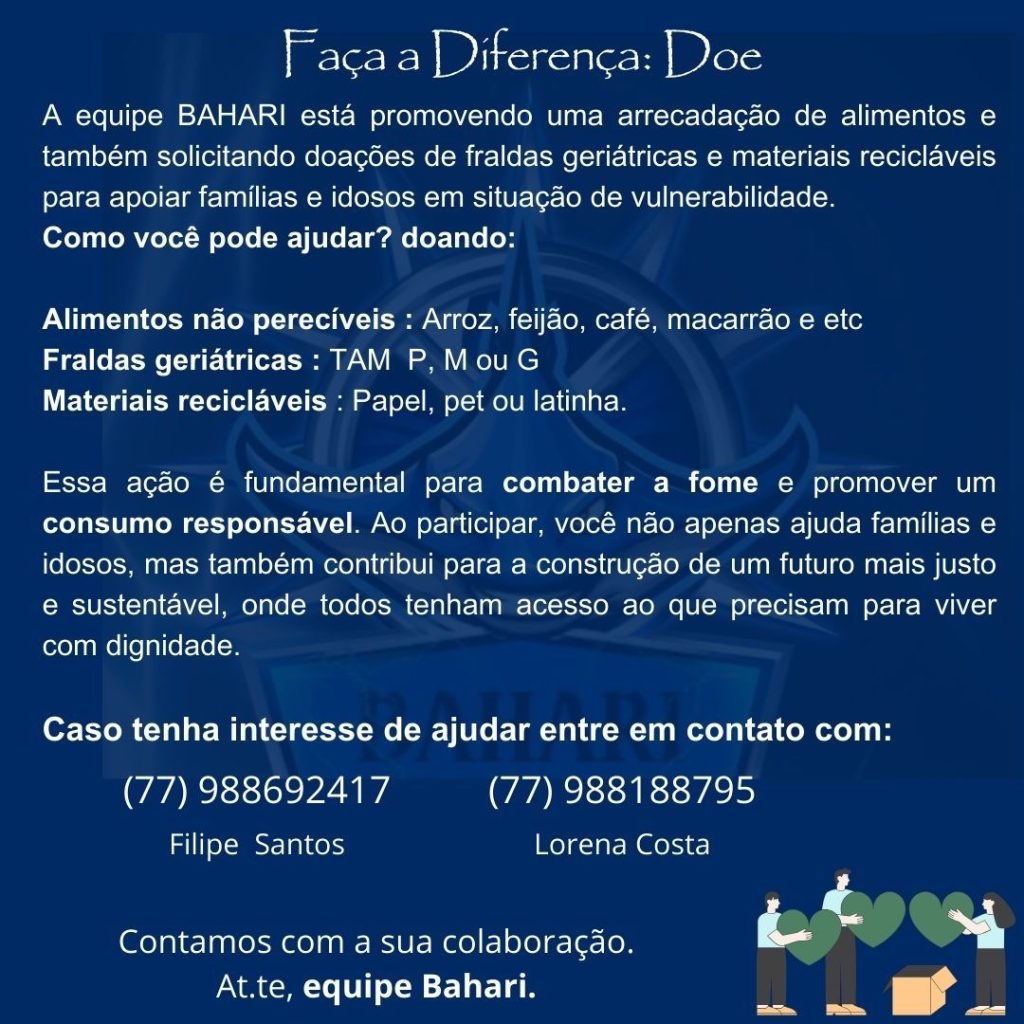 A equipe BAHARI está promovendo uma arrecadação de alimentos e também solicitando doações de fraldas geriátricas e materiais recicláveis para apoiar famílias e idosos em situação de vulnerabilidade. O repórter Mateus Araújo conversou com Felipe, o responsável pelo projeto e trás mais informações, CLIQUE NA ÍNTEGRA E OUÇA A MATÉRIA NA ÍNTEGRA: