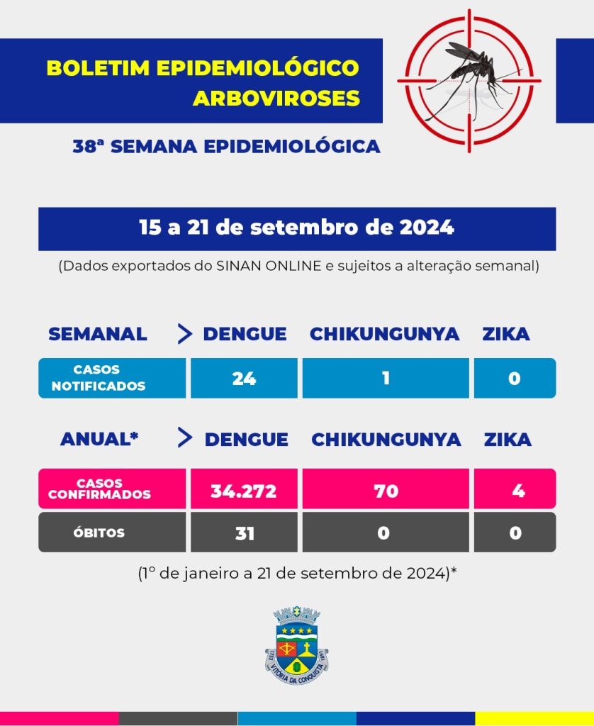 A Secretaria Municipal de Saúde (SMS) divulgou nesta terça-feira (24), o Boletim Epidemiológico referente à 38ª semana de 2024, abrangendo o período de 15 a 21 de setembro. Durante esses dias, foram notificados 24 casos de dengue e um de chikungunya, sem nenhum registro de zika. Até o momento, o município contabiliza 31 óbitos confirmados por dengue. O número de casos confirmados continua o mesmo da semana anterior.