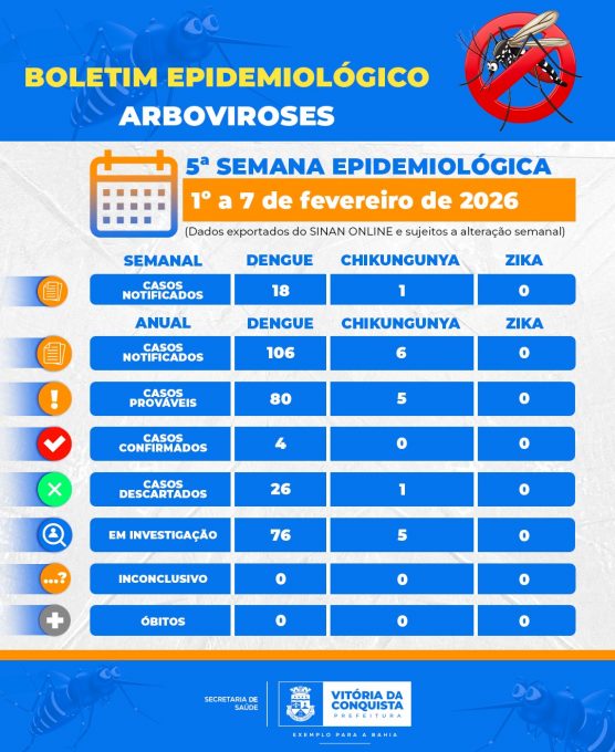 A Prefeitura de Vitória da Conquista divulgou o Boletim das Arboviroses com 19 notificações. O monitoramento foi realizado pela Secretaria Municipal de Saúde (SMS), por meio da Coordenação de Vigilância Epidemiológica (Viep), referente à 5ª Semana Epidemiológica, que analisou os dados de 1º a sete de fevereiro.