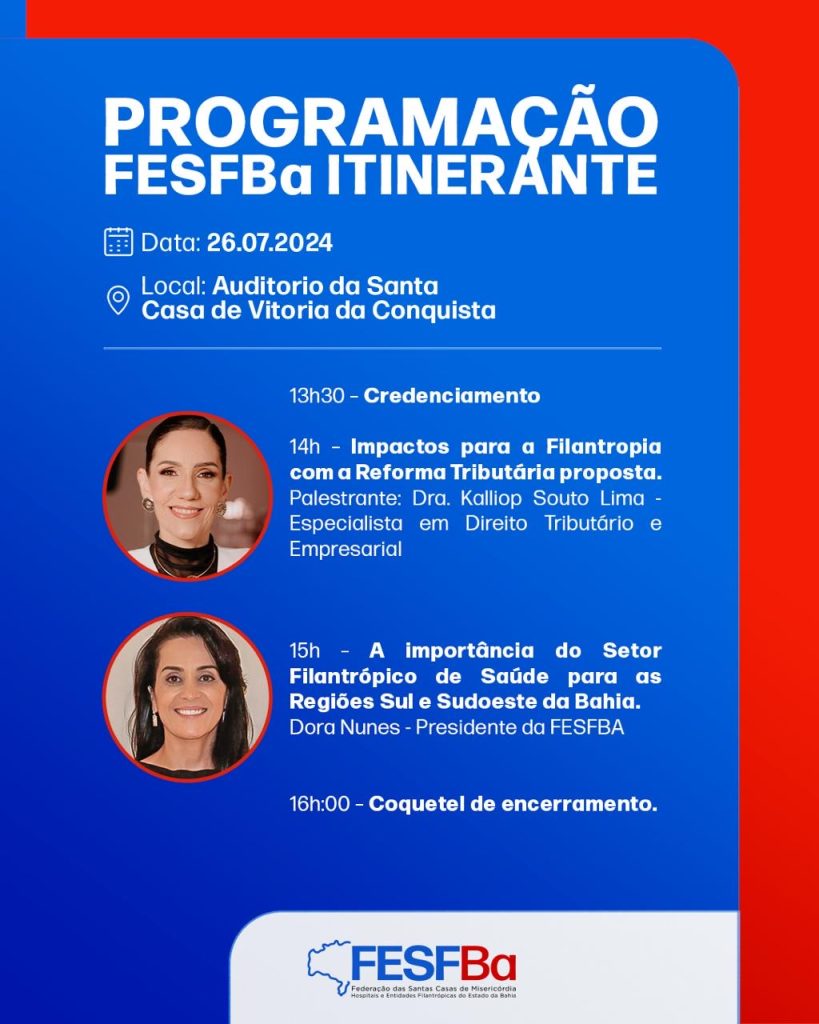 Na próxima semana – de 24 a 26 de julho – a presidente da Federação das Santas Casas, Hospitais e Entidades Filantrópicas do Estado da Bahia (FESFBA),Dora Nunes, visita entidades filantrópicas de saúde das regiões Sul e Sudoeste, dando continuidade ao Programa FESFBA Itinerante. A visita termina no dia 26, em Vitória da Conquista, com um encontro no auditório da Santa Casa , reunindo entidades filantrópicas das duas regiões, a partir das 14 horas .A programação começa com palestra da advogada e professora Kalliop Souto Lima sobre “Impactos para a Filantropia com a Reforma Tributária Proposta” e terá continuidade com a apresentação de Dora Nunes sobre “A importância do Setor Filantrópico de Saúde para a Região Sul e Sudoeste da Bahia”.