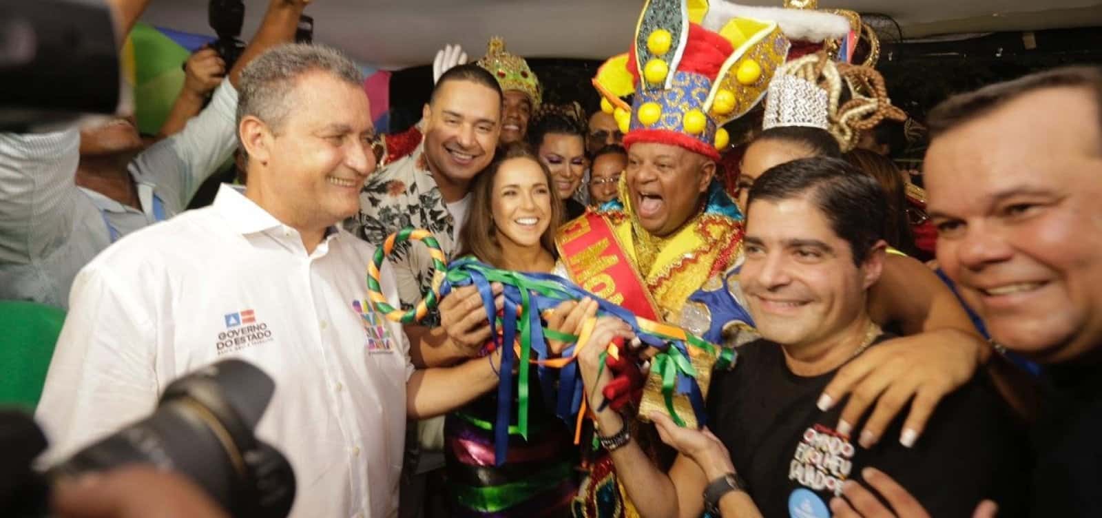 O Rei Momo recebeu hoje (28) das mãos do prefeito ACM Neto (DEM) e do governador Rui Costa (PT) as chaves da cidade e iniciou o Carnaval de Salvador. Em cerimônia realizada no Campo Grande, num camarote da prefeitura, o educador social Renildo Barbosa, de 42 anos, coroado como chefe da folia baiana, ergueu o símbolo que representa a capital baiana e os festejos.