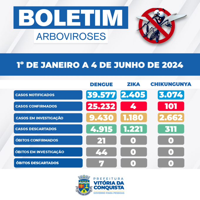 Até esta terça-feira (4), foram notificados 39.577 casos suspeitos de dengue, com 25.232 confirmados. Também foram registradas 3.074 notificações de chikungunya, com 101 casos confirmados, e 2.405 notificações de zika, com quatro confirmações.