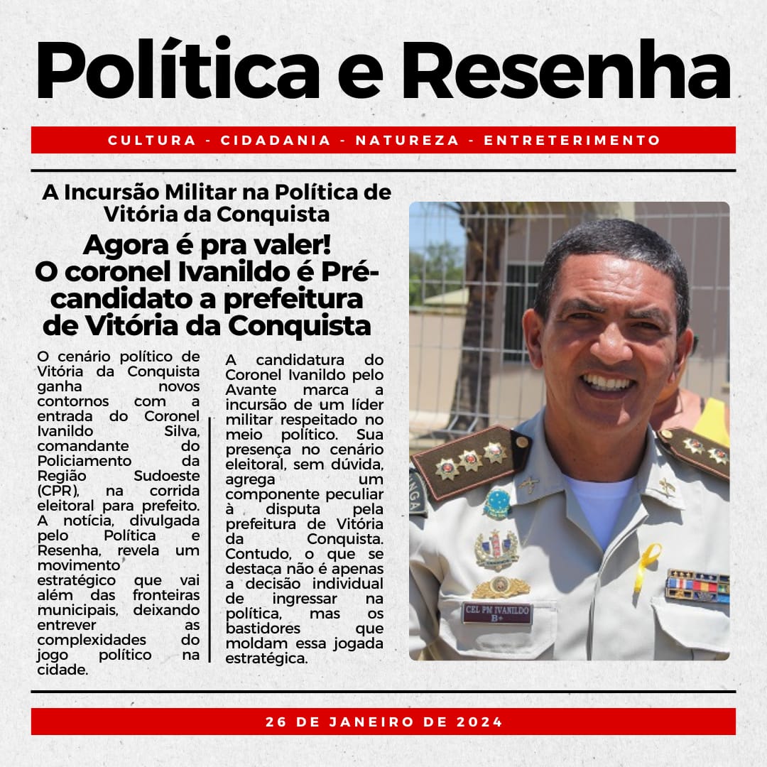 Muitos nomes estão sendo apresentados para disputar a prefeitura de Vitória da Conquista nas eleições 2024. Entre os nomes, está o do Coronel Ivanildo da Silva que deve disputar o pleito pelo partido AVANTE. De acordo com informações, “Trata-se de uma estratégia elaborada em gabinete forte de Brasília”. Outros nomes também são especulados, além dos já dispostos como a prefeita Sheila Lemos (UB), e Waldenor Pereira ( PT) e Lúcia Rocha ( MDB).