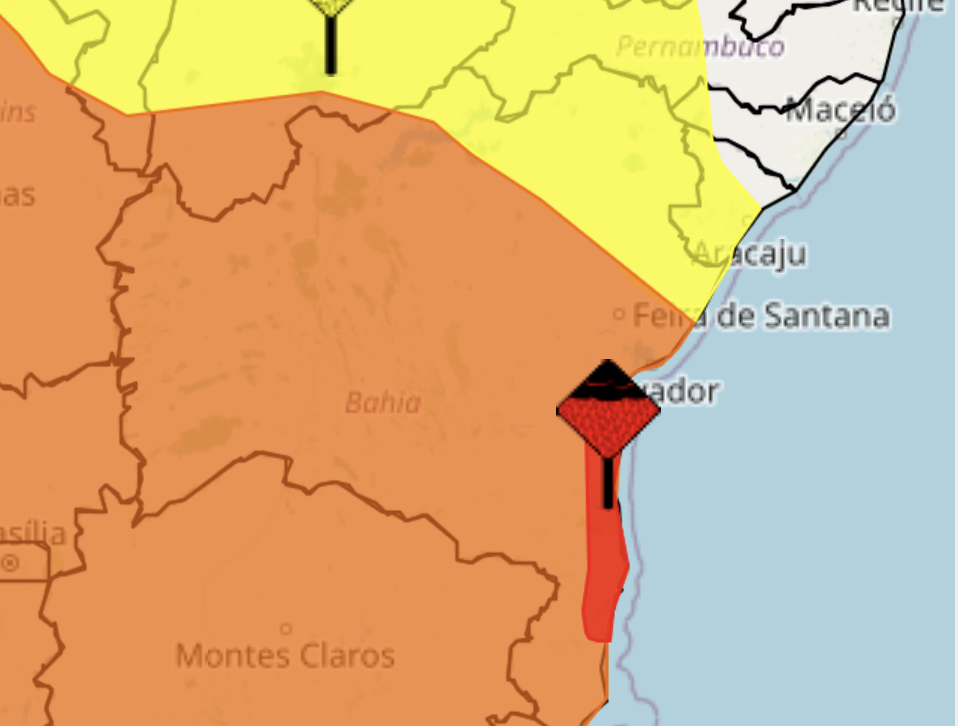 A Bahia também tem 370 municípios em alerta laranja, com possibilidade de chuvas ente 30 e 60 mm/h ou 50 a 100 mm/dia, com ventos intensos, com rajadas de 60 a 100 km/h.