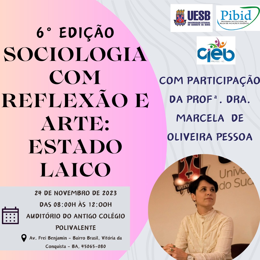 Será realizado nos dias 22, 23 e 24 de novembro, a 6 Edição do projeto “Sociologia com Reflexão e Arte”. O evento, que faz parte do projeto de Ciências Sociais da UESB contará com diversas palestras sobre assuntos sociais recorrentes, como a desigualdade social e o racismo. O projeto será realizado no auditório do antigo Colégio Polivalente, Será no Auditório do antigo Colégio Polivalente, atual módulo II do CIEB Complexo Integrado de Educação da Bahia, a partir das 8h:00 da manhã.