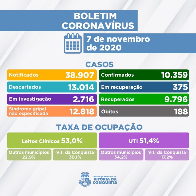 Até este sábado (7), Vitória da Conquista registrou o total de 10.359 casos confirmados da Covid-19, sendo que 9.796 deles são de pessoas já recuperadas. Outros 375 pacientes diagnosticados com a doença continuam em processo de recuperação (28 internados e 347 em tratamento domiciliar) e 188 moradores do município evoluíram para óbito.