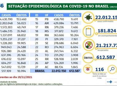 O Brasil registrou 8.833 novos casos de Covid-19 e 217 mortes pela doença no último sábado (20), segundo o boletim epidemiológico divulgado pelo Ministério da Saúde. Desde o início da pandemia, foram registrados 22.012.150 casos e 612.587 óbitos.