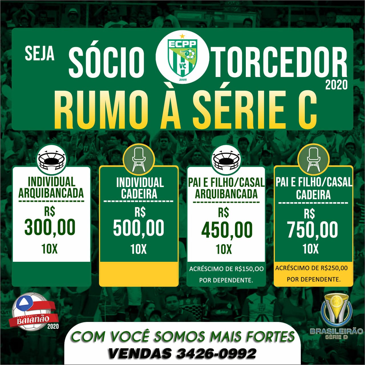 Vendas na sede administrativa do clube, situado na rua Edmundo Santos, n•65, Bairro: São Vicente ou pelo número (77)3426-0992.