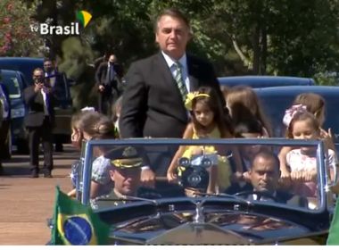 Sem o uso de máscara, o presidente chegou ao evento no Rolls Royce presidencial, acompanhado por crianças também desprovidas do item de segurança individual.