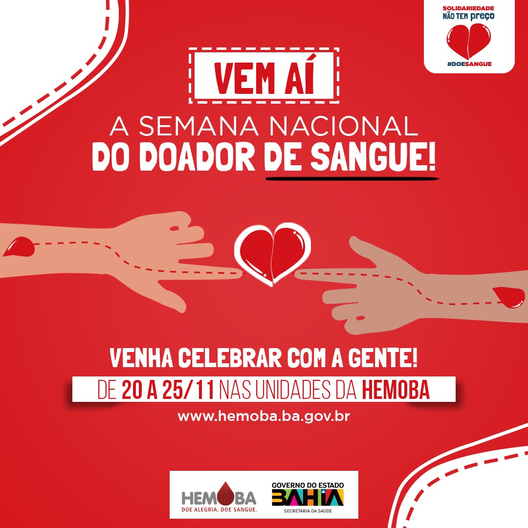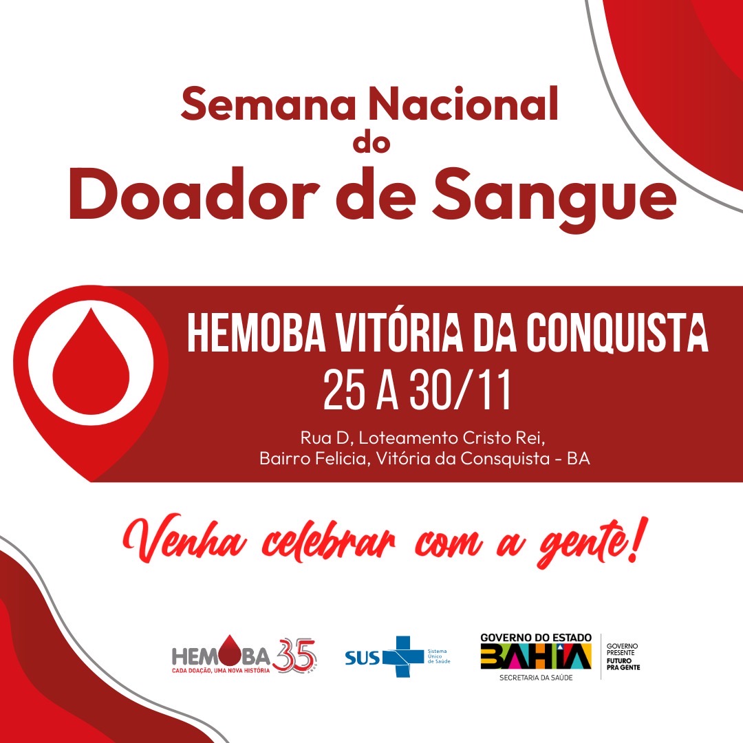 “Novembro é o mês da solidariedade! Junte-se a nós para celebrar o Dia Mundial do Doador de Sangue (25/11) e homenagear aqueles que fazem da doação um ato de amor. De 25 a 30/11, participe da Semana do Doador na Hemoba e ajude a salvar vidas. Venha fazer parte dessa história e comemorar os 35 anos de dedicação à vida!”, convida o Hemoba.