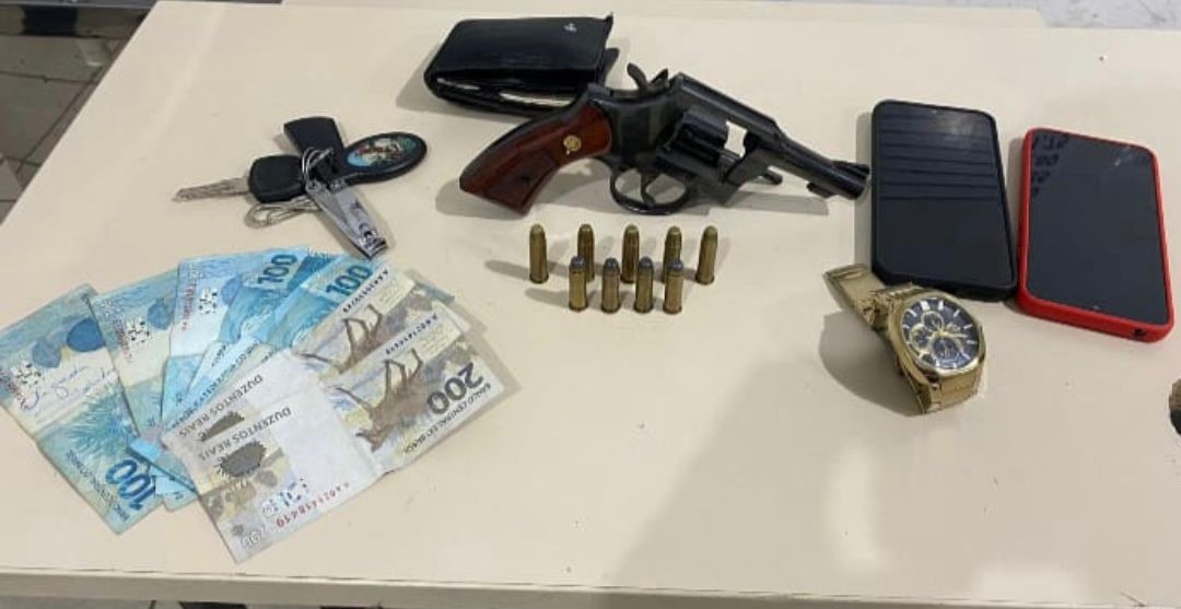 Por volta da 00h15, uma guarnição realizava rondas no Distrito de Barra do Choça, na localidade de Cafezal, quando abordou uma motocicleta e notou a aproximação de outro veículo, que tentou evadir-se. A equipe fez a abordagem de um carro com cinco ocupantes: dois menores, duas mulheres e um homem armado com uma pistola carregada com seis munições e mais três em uma pochete, além de R$ 1.000,00 em espécie e outros pertences. O homem foi preso e algemado para garantir a segurança de todos, devido ao risco de fuga e à potencial ameaça. O veículo foi retido no complexo policial de Barra do Choça por falta de combustível para deslocamento a Vitória da Conquista. Por fim, todos os ocupantes do veículo foram conduzidos ao Plantão Policial para adoção das medidas cabíveis.