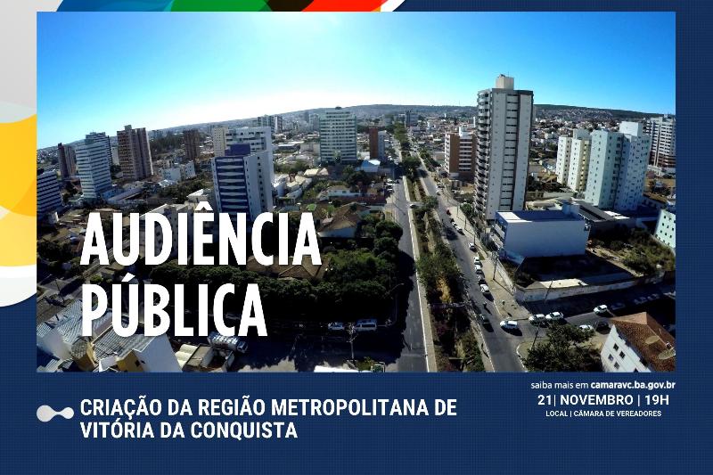 Na noite desta quinta-feira, 21, às 19h, a Câmara Municipal de Vitória da Conquista (CMVC) promoverá uma audiência pública para debater a criação da Região Metropolitana de Vitória da Conquista. A audiência é uma iniciativa do mandato do vereador Ivan Cordeiro (PL).