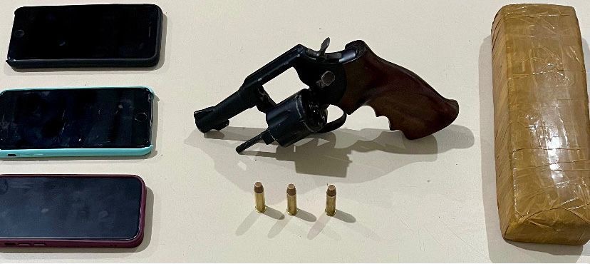 Todo material encontrado foi conduzido juntamente com os suspeitos, sendo: 01 revólver calibre .38; 03 munições intactas do mesmo calibre; 01 barra de substância análoga a maconha e 03 aparelhos celulares.