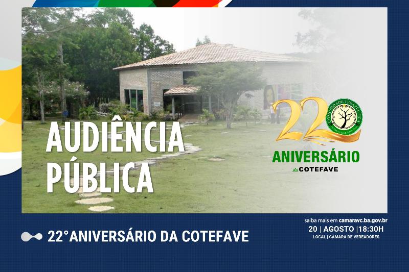 Nesta terça-feira, 20, a Câmara Municipal de Vitória da Conquista realiza uma Audiência Pública para celebrar os 22 anos da Comunidade Terapêutica Fazenda Vida e Esperança (Cotefave). A Audiência acontece no Plenário Carmen Lúcia, às 18h30.