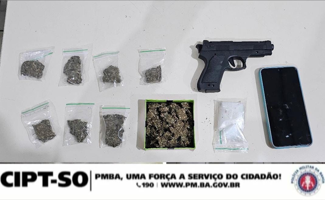 Na noite de ontem (31) durante patrulhamento ostensivo no Bairro Senhorinha Cairo, a guarnição da CIPT-SO se deparou com uma transeunte, que disse ter sido vítima de uma tentativa de assalto ali próximo há poucos minutos atrás. Descrita a características do suspeito, foi feito rondas pela localidade e posteriormente localizado um indivíduo com as mesmas características citadas pela vítima, no Anel Viário próximo a entrada do bairro Miro Cairo. Após a abordagem e busca pessoal, foi identificado que o suspeito usava uma tornozeleira eletrônica e foi encontrado com o mesmo um simulacro de arma de fogo e 01 troxinha de maconha. Ao ser indagado acerca da tentativa de assalto, o mesmo negou à denúncia, porém, confirmou está ali traficando. Informou também , que em sua residência localizada no bairro primavera, teria mais outra quantidade da droga. De imediato e acompanhado pelo infrator, a guarnição deslocou até a sua residência, onde foi comprovando a veracidade da informação.