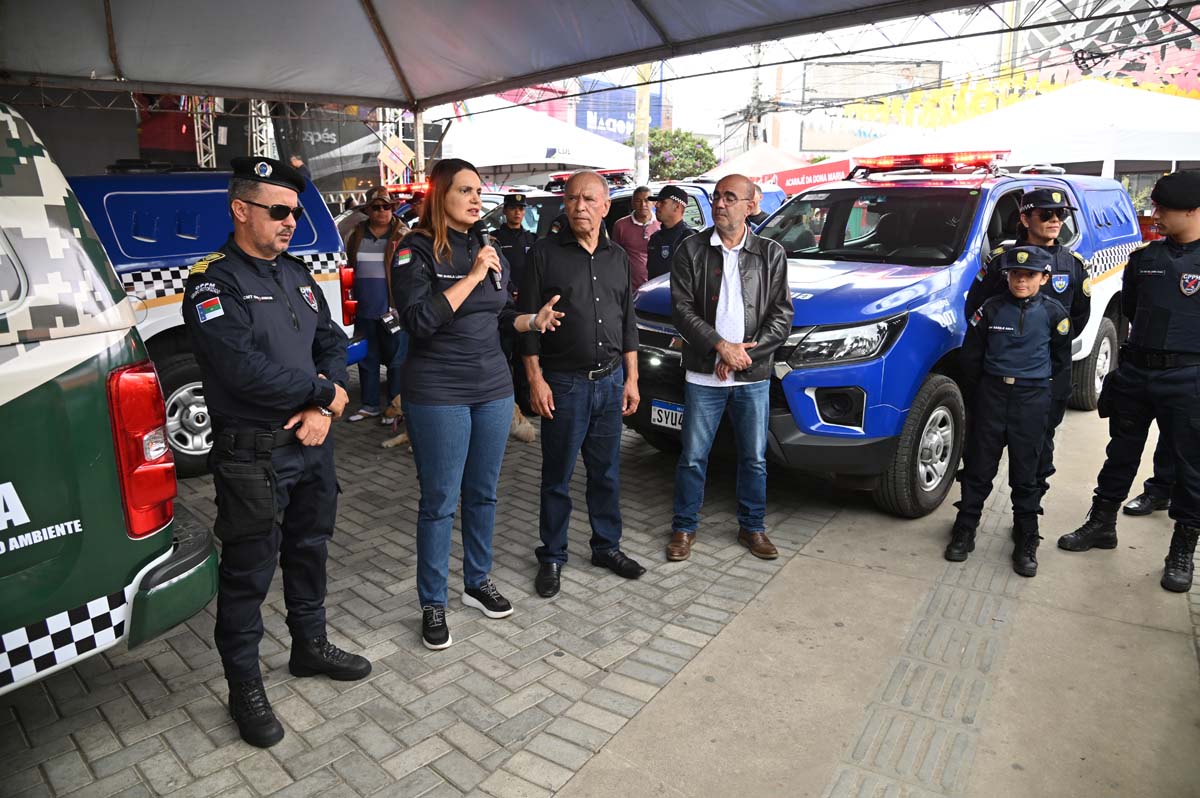 O Governo Municipal entregou, neste sábado (15), seis novas viaturas para a Guarda Municipal, na Praça Nove de Novembro. Com o uniforme da Guarda, a prefeita Sheila Lemos, em seu discurso, lembrou que Vitória da Conquista é a cidade mais segura do estado e a segunda melhor cidade do Nordeste para se viver. A gestora também elogiou o trabalho da Guarda Municipal, que completou três anos neste mês, e destacou o investimento do Governo Municipal em trabalhar pela segurança do município.