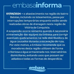 A Empresa Baiana de Águas e Saneamento (Embasa) informa que o abastecimento na região do bairro Bateias, incluindo os loteamentos, passa por interrupções temporárias enquanto estão sendo realizadas obras de drenagem nesta região de Vitória da Conquista.