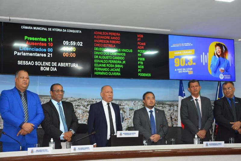 Durante a manhã desta sexta-feira, 02, foi realizada na Câmara Municipal de Vitória da Conquista, a primeira sessão legislativa de 2024, após o período de recesso parlamentar ocorrido no mês de janeiro. A sessão de abertura dos trabalhos, contou com o pronunciamento do presidente da Casa Legislativa, o vereador Hermínio Oliveira (PODE) e do secretário de infraestrutura urbana do município, Jackson Yoshura, representando a prefeita municipal Sheila Lemos (UB), que não pode se fazer presente. Além desses, compareceram a sessão vereadores, secretários, servidores municipais e representantes da comunidade conquistense.
