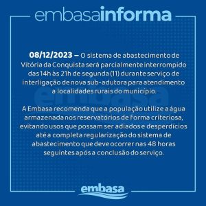 Embasa informa que o sistema de abastecimento de água de Vitória da Conquista será parcialmente interrompido, a partir das 14h da próxima segunda (11), para serviço de interligação de subadutora que atenderá localidades rurais do município.