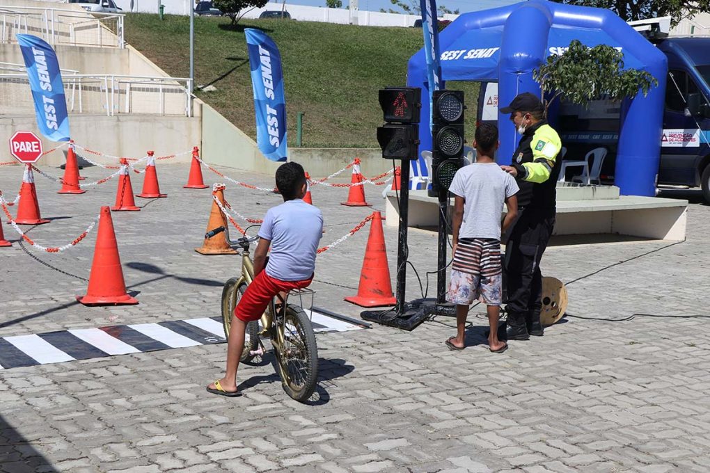 O passeio na Praça Norberto Aurich, na manhã deste domingo (11), foi diferente para o estudante Heitor Viana, 10 anos, e para outras crianças e adultos que estavam no local. Isso porque a Secretaria Municipal de Mobilidade Urbana (Semob), em parceria com o Sest/Senat, utilizou o espaço para realizar uma ação educativa sobre o trânsito, com palestras, jogos e brincadeiras.