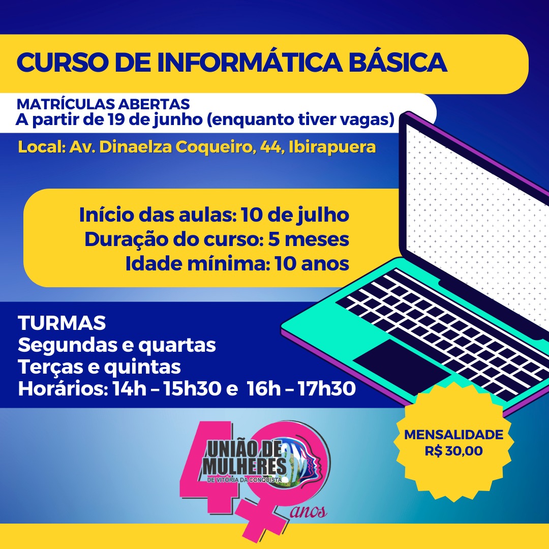 Estão abertas as inscrições para um curso popular de informática básica, ofertado pela União de Mulheres de Vitória da Conquista (UMVC/UBM). As matrículas podem ser feitas a partir desta segunda-feira, 19, em horário comercial, na sede da instituição, na Av. Dinaelza Coqueiro, 44, no bairro Ibirapuera.