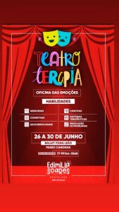 Será realizado entre os dias 26 a 30 de junho o projeto “Teatro Terapia”, voltado para as crianças conquistenses. Este projeto que é uma novidade em Vitória da Conquista e além de ser uma excelente opção para as crianças curtirem as férias, é uma experiência inovadora e criativa.