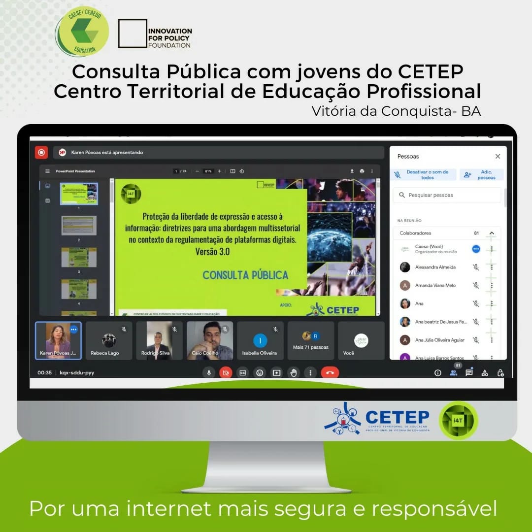 No CETEP, respondendo ao chamado do Centro de Altos Estudos em Sustentabilidade e Educação e da Innovation For PolicyFoundation, esses jovens da era da internet se mobilizaram para contribuir com a avaliação da regulamentação das plataformas digitais. A reunião foi organizada pelo Professor Flávio Flores e começou às 7:00 da noite, horário de Brasília. Em apenas meia hora, mais de 110 jovens já se emocionavam com a oportunidade de expressar suas opiniões “por uma internet de confiança”.