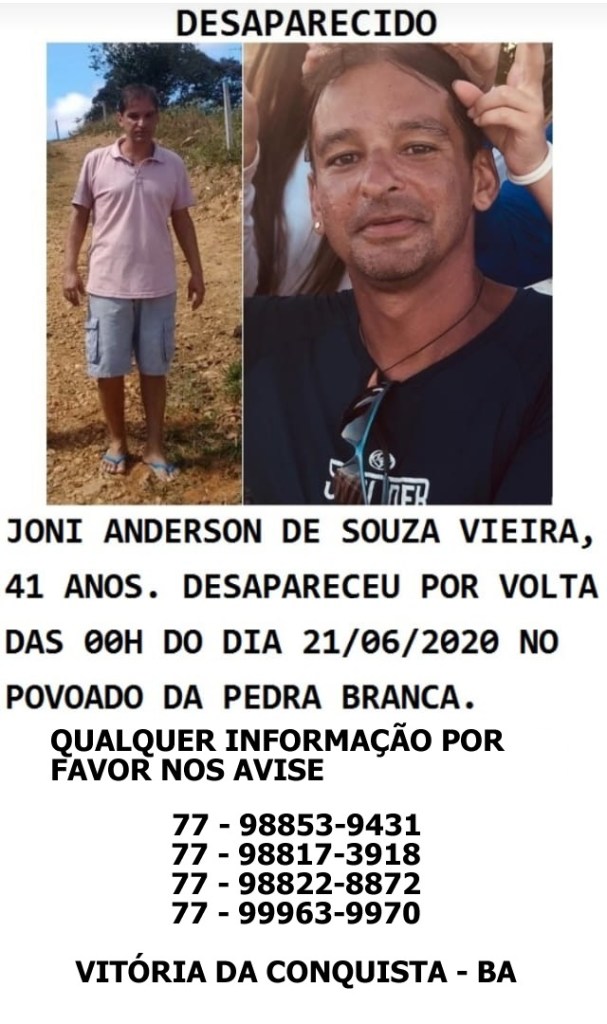 Está desaparecido, desde o último dia 21 de junho,  Joni Anderson de Souza Vieira,41. Segundo informações, ele saiu de casa no povoado da Pedra Branca, zona rural de Vitória da Conquista, por volta das 0h:00.