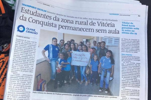A falta de aulas na Rede Municipal de Ensino provocou um protesto na Prefeitura de Vitória da Conquista na manhã da quarta-feira (31). Ainda sem solução, o problema voltou a virar manchete no A Tarde, um dos mais importantes jornais impressos do Nordeste Brasileiro. Em nota ao A Tarde, a Secretaria Municipal de Educação reconheceu a situação e disse que o processo licitatório para contratação de empresas para o Transporte Escolar foi homologado, mas não ainda não tem previsão para retomada das atividades nas unidades da Zona Rural.